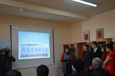 At 11 a.m. on 26th December, the inauguration ceremony of the Center of Chinese Language and Culture was held in Slavic University, under the DUFL’s Confucius Institute of Everan State University of Language and Social Science in Armenia. Chinese ambassador plenipotentiary to Armenia Tian Erlong and his wife Zhang Yingmei attend the ceremony. Other distinguished attendees included the dean of the Confucius Institute, representatives of teachers and students, the leaders of Slavic University, the students of Chinese major and the press representatives from China and Armenia. The president of DUFL, Professor Sun Yuhua sent a message of greetings.