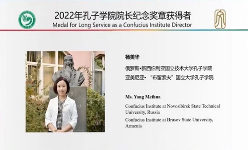 Yang Meihua, the Chinese director of Confucius Institute in Russia, won the Confucius Institute Director Memorial Medal in 2022.