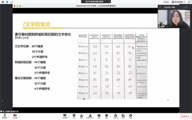 On the afternoon of November 23rd, the School of Asian-African Languages invited Zhu Meng, Associate professor of the School of Oriental Languages of Shanghai International Studies University, Doctor of Asian and African Languages and Literature, and master's supervisor, to give an online lecture on the theme of "Thai Language from a Historical Perspective" to the students of the School of Asian-African Languages. The lecture was hosted by Ms. Li Shufang, Director of the Department of Thai major of school of Asian and African languages. Foreign teacher Wu Bingfa and all students of school of Asian and African Languages Thai major participated in the lecture.