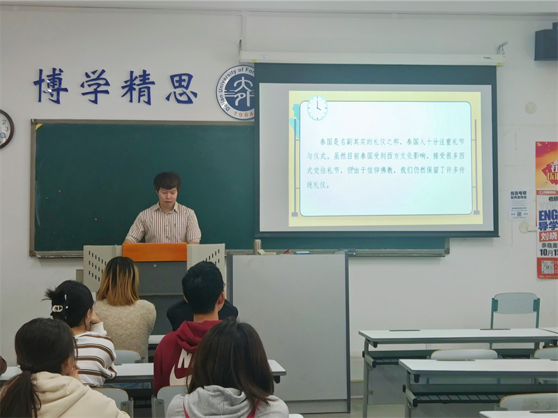 Teacher Wu Bingfa introduced the general situation of Thailand to the students from the aspects of Thailand, and briefly explained the history of Thailand to the students with the reference of Thai currency. He also interpreted the etiquette culture of Thailand by means of short videos, introduced the famous Songkran Festival and Loy Krathong Festival in detail to the students, and gave a brief description of other Thai festivals. In the class, Teacher Wu Bingfa showed the students common Thai expressions and common distress calls. This will provide substantial help for the future study and life of students in Thailand.