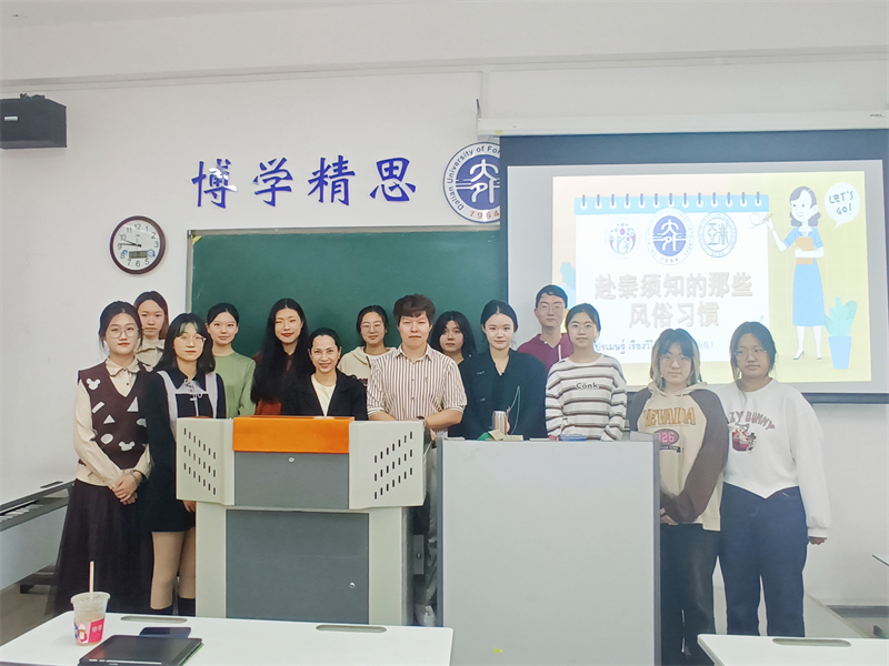 In order to enhance students' understanding of Thai culture, the School of Languages and Languages of Asia and Africa held a talk on the theme of "What You Should Know when Going to Thailand" in the afternoon of 30 October at the Li Xue Building. The lecture was delivered by Mr. Wu Bingfa, a foreign teacher specializing in Thai. Li Shufang, director of the Teaching and Research Office of Thai Language Major, Zhang Jialin, foreign teacher of Thai language major Chen Bailu, and all students of Thai language major in 2022 attended the lecture.