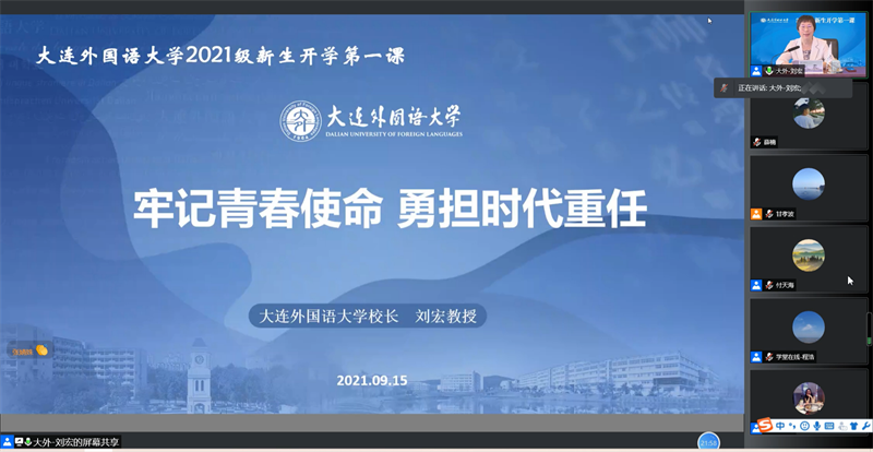 校长刘宏以“牢记青春使命 勇担时代重任”为题,通过“线上+线下”同步的方式,从大外的校史校情、大外人新时期的时代使命、努力做勇担时代重任的大外人三方面为学生上了一堂生动的开学第一课。刘宏校长首先带领大家回顾了学校57年的奋斗历程和瞩目成就,勉励同学们传红色基因,承时代使命,用实际行动诠释大外人与党同心、与国同行的时代担当。刘宏校长强调,今年是中国共产党成立100周年,学习习近平总书记在庆祝中国共产党成立100周年大会上的重要讲话精神对于青年学生具有重要意义。从日本语学院退休教师罗兴典教授的老一辈革命者事迹,到高山之国开出青春之花的吕莹同学,在“油画塔城”绽放志愿青春的邵宏第同学,再到新一代大外人在国际传播、抗击疫情、脱贫攻坚等领域所作出的突出贡献,她以生动的事例鼓舞同学们发挥专业专长,做中国观点的传播者,中国立场的阐释者,中国形象的塑造者。国际传播不仅是宣传和新闻部门的事,也不仅是公共外交领域的工作,更与大外学子们息息相关。希望同学们把爱国情、强国志、报国行自觉融入实现伟大梦想的青春奋斗之中,服务于国家对外开放战略和“一带一路” 建设、国家治理与全球治理、中华(语言)文化“走出去”、国际传播能力建设与文明交流互鉴促进世界文明对话,学习人类命运共同体的理念和思维。