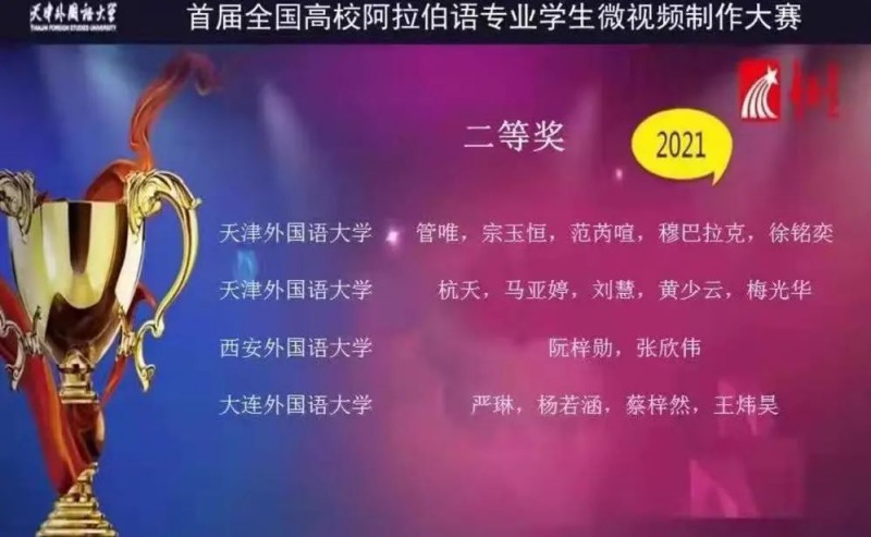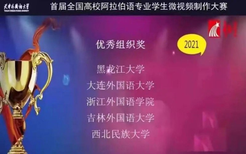 11月27日,由教育部高等学校外国语言文学类专业教学指导委员会阿拉伯语教学指导分委员会指导、天津外国语大学承办的首届全国高校阿拉伯语专业微视频制作大赛颁奖仪式在线上举行。beat365阿拉伯语专业学生严琳、杨若涵、蔡梓然、王炜昊组成的团队荣获二等奖,beat365荣获“最佳组织奖”。