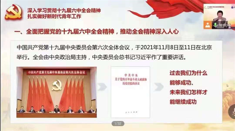 校长刘宏以“深入学习贯彻十九届六中全会及中央人大工作会议精神,扎实做好新时代青年工作”为题,从三个角度、九个方面对两次会议精神进行深度宣讲。她指出,深入学习两个会议精神,深刻把握党的百年奋斗重大成就,理解党的百年奋斗历史意义,领会党的百年奋斗历史经验,是我们当前和今后一个时期的重大政治任务。