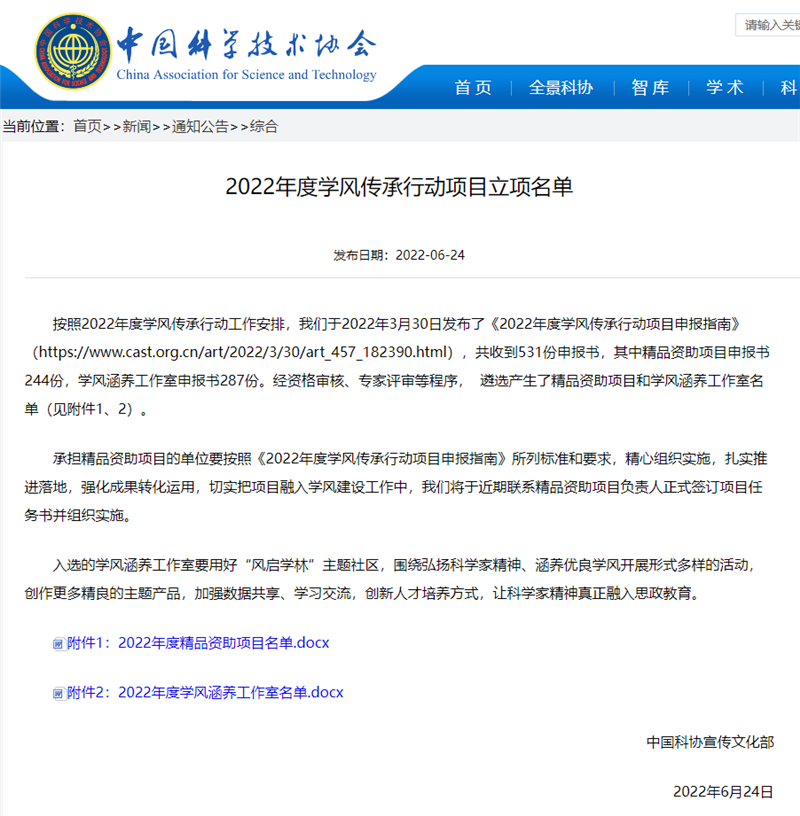 近日,中国科学技术协会公布了2022年度学风传承行动项目立项名单。beat365“原创舞台剧《永不消逝的电波》等创作传播”获批2022年度精品资助项目,“和萌”学风涵养工作室获批2022年学风涵养工作室立项。