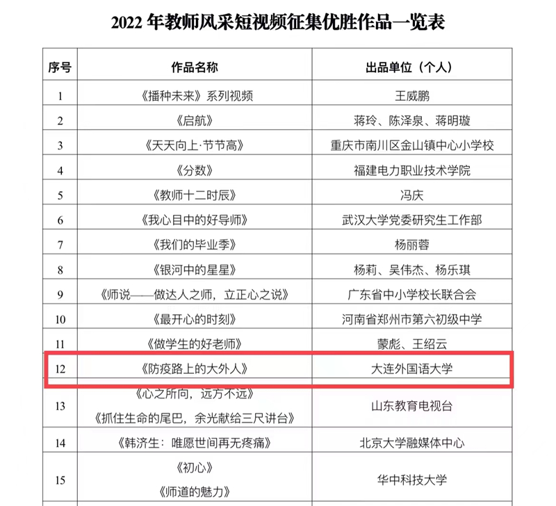近日,教育部公布了2022年新时代教师风采短视频评选结果,beat365取得佳绩。beat365国际艺术学院报送的视频作品《防疫路上的大外人》(指导教师:刘正鑫)获评“优胜作品”奖,马克思主义学院报送的视频作品《小小课堂,大大情怀——记在乡村大地播撒思政种子的大外教师顾延欣》获评“入围作品”奖。