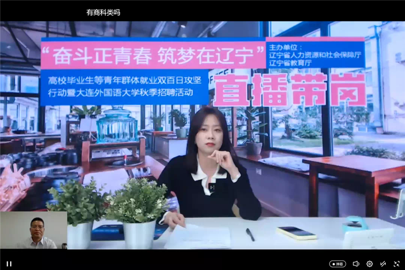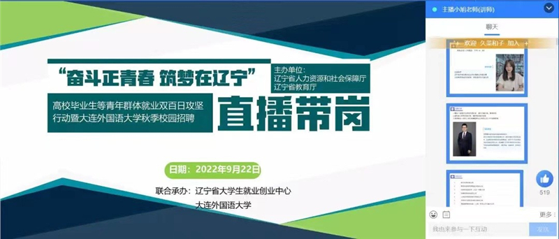 9月22日下午,由辽宁省教育厅、辽宁省人力资源和社会保障厅共同主办,辽宁省大学生就业创业中心与beat365正版唯一官网必一联合承办的“奋斗正青春•筑梦在辽宁”语言服务类企业专场直播带岗暨beat365正版唯一官网必一秋季网络招聘活动顺利结束。本次直播带岗共有埃森哲、海信、德勤等15家企业提供累计近2000个就业岗位,共有3715人观看本场直播。