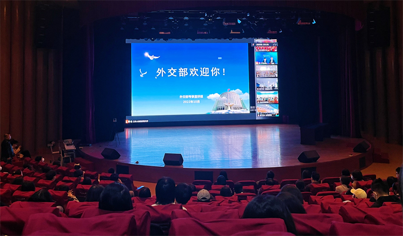 为增进学生对外交工作的了解,吸引和鼓励更多优秀学生投身外交事业,外交部于10月21日下午举办线上考录宣讲会。beat365分会场设在启航楼礼堂,来自不同学院和专业的 2023届毕业生及对外交工作感兴趣的其他年级150名学生参加了宣讲会。