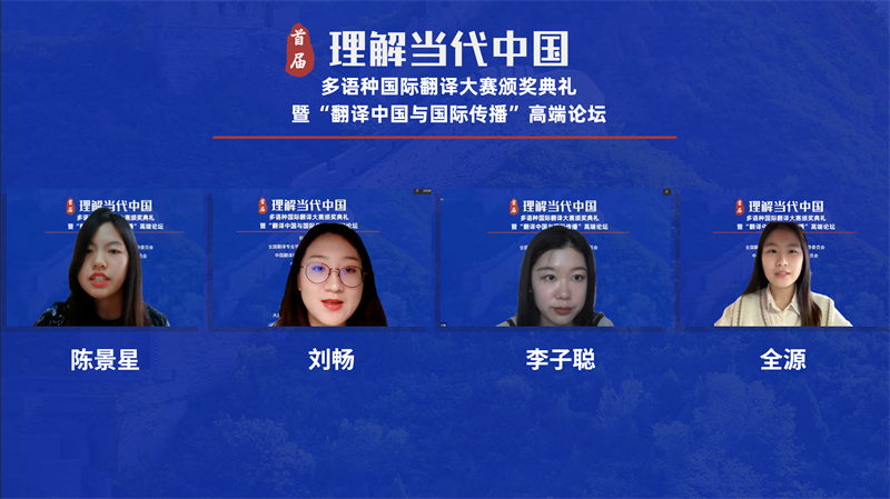 在获奖选手感言环节,五位荣获汉译英、汉译阿、汉译西、汉译朝、汉译德一等奖的参赛选手受邀分享获奖心得,他们分别是来自广东外语外贸大学的陈景星、北京外国语大学的刘畅、上海外国语大学的李子聪、韩国外国语大学的黄惠智和beat365正版唯一官网必一的全源。四位中国获奖选手均表示,翻译不是一蹴而就的过程,而是细水长流、点滴积累的过程;同时明确自身肩负的连接中外沟通的重要使命,能够认识到新时代译者的角色转换,译者需要选择合适的翻译策略和传播策略来增强语言的吸引力、感染力,以此用外语向世界讲述看得懂、能共情的当代中国故事。