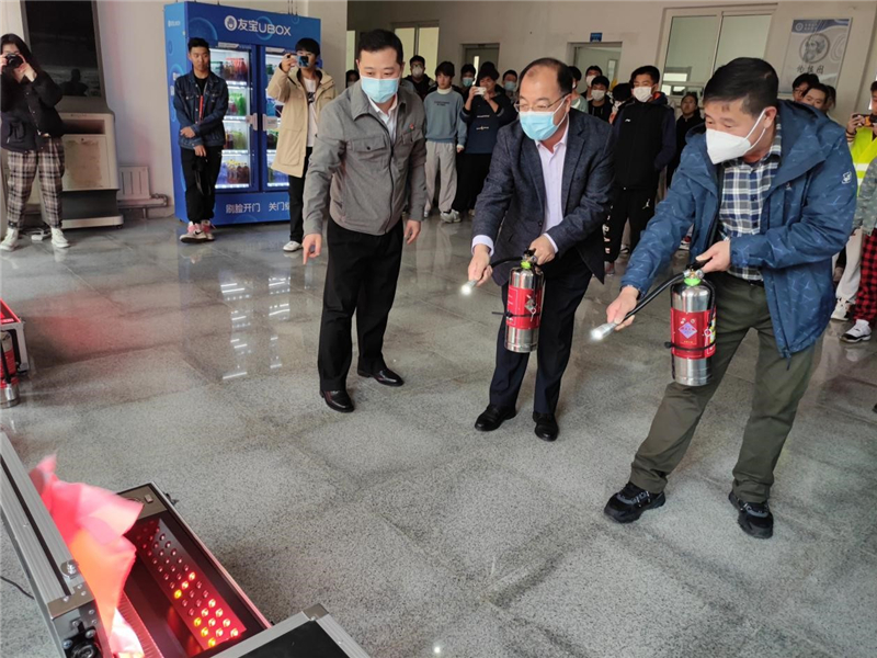 13点19分,消防警报声响起,伴随着滚滚“浓烟”,学生们有序撤离教室,四位穿着消防服的学生熟练使用灭火器扑灭明火。警报解除后,全体学生回到教学楼,丛明才副校长现场指导了灭火实训教学系统和模拟灭火器使用方法。