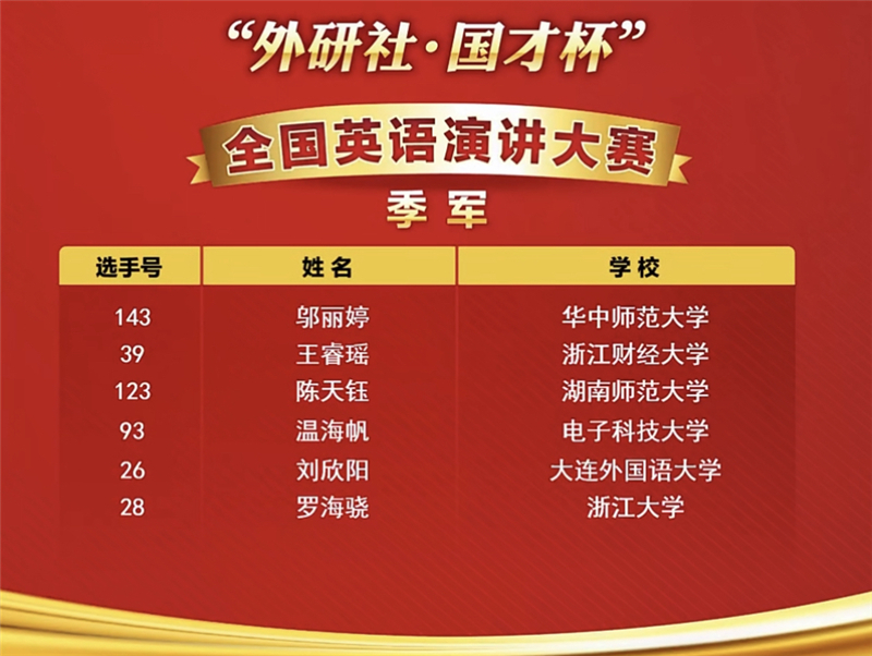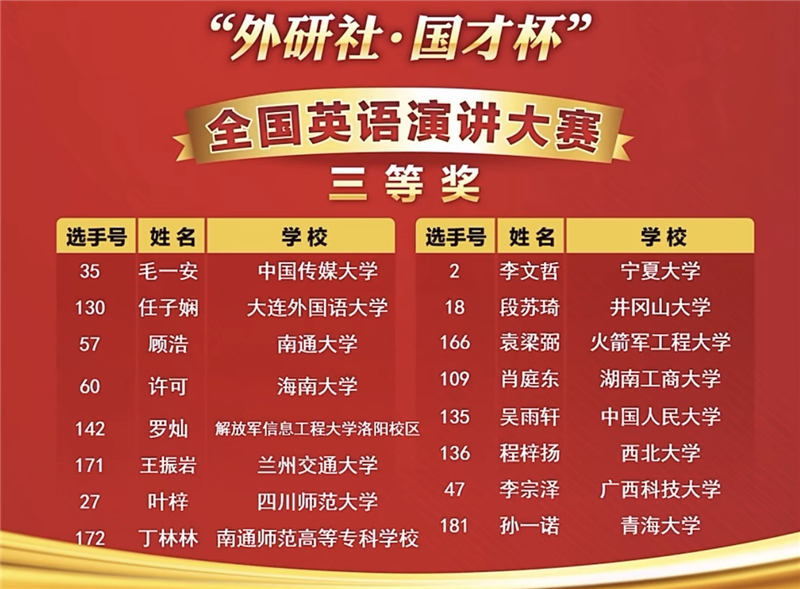 “外研社·国才杯”全国英语演讲大赛创办于2002年,在国内外广受关注,已成为全国参赛人数最多、规模最大、水平最高的英语演讲赛事之一,并于2019年作为唯一的英语类竞赛入选全国高校学科竞赛排行榜。(李春姬)