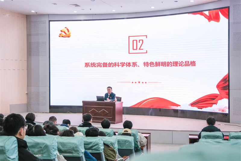 王书记从党的发展历程出发,阐释了党的二十大的重大意义,通过9个数字引导学生深入学习党的二十大报告的核心要义与理论精髓。他运用马克思主义立场观点方法,聚焦新的时代命题,论述了习近平新时代中国特色社会主义思想的形成背景、理论品格、实践伟力和历史地位。他指出,习近平新时代中国特色社会主义思想,是党的十八大以来以习近平同志为核心的党中央推进党的指导思想与时俱进,创新发展中国特色社会主义理论体系,形成的党的理论创新重大成果,是全党全国人民为实现中华民族伟大复兴而奋斗的行动指南。