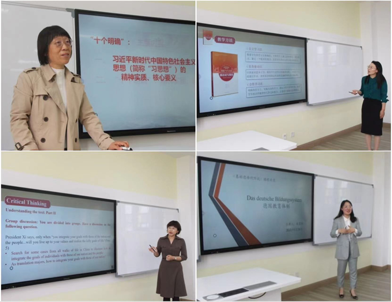 本次调研会分为课程思政工作坊活动和师生调研座谈两个环节。在课程思政工作坊活动中,马克思主义学院王丹教授以“深刻认识和把握‘十个明确’的深刻内涵”为主题对与会师生进行了课程思政内容辅导。王丹教授从“十个明确”的提出背景、主要内容、精神实质等方面阐述了“十个明确”的核心要义及其与“十四个坚持”“十三个方面成就”之间的关系,强调了“十个明确”在习近平新时代中国特色社会主义思想中的重要地位。通过王丹教授的讲解,师生更加深刻理解了《理解当代中国》多语种系列教材编写的理论依据。随后,俄语学院刘艳春、高级翻译学院许丹、德语学院朱雯熙三位老师分别进行了课程思政示范课的课堂教学展示。