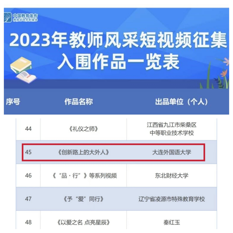 近日,教育部公布了2023年新时代教师风采短视频评选结果,beat365创新创业学院报送的视频作品《创新路上的大外人》(主创人员:韩业亮、王科、李绍华)获评“入围作品”奖。
