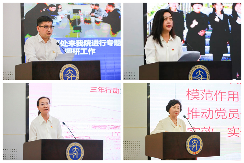 会上,英语学院党委、俄语学院党总支、欧洲语言学院党总支、国际关系学院直属党支部书记作交流发言,围绕推进二级党组织主题教育走实走深的工作举措、显著成效、主要经验进行总结交流。