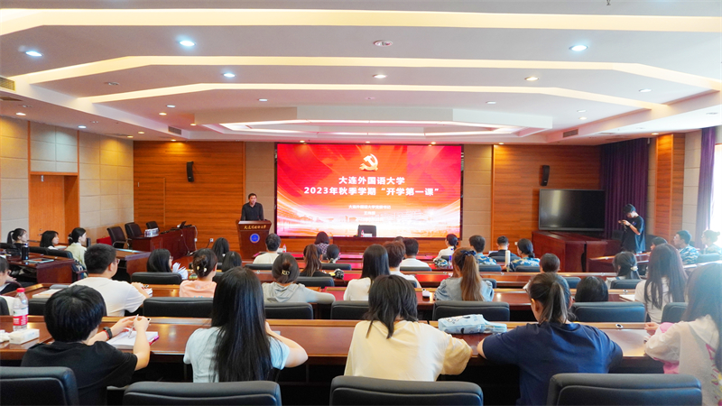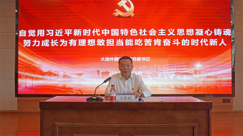 王伟辰书记以《自觉用习近平新时代中国特色社会主义思想凝心铸魂 努力成长为有理想敢担当能吃苦肯奋斗的时代新人》为题,结合思政课“习近平新时代中国特色社会主义思想概论课”进行讲授。他向同学们介绍了大外的发展定位、学科布局和专业特色,带领同学们共同学习了习近平总书记关于建设教育强国的重要论述,深入分析了习近平新时代中国特色社会主义思想的发展脉络、核心内容和历史地位。他指出,在建设教育强国和人工智能发展的大背景下,外语教育进入转型发展关键阶段。应对变局,大外人更应该胸怀“国之大者”,把握外语学习与科技发展趋势的结合点,找准方向,抓住机遇,做好规划,有力作为,努力学好各类科学文化知识,熟练掌握语言技能,积极投身建设有中国特色的社会主义事业的伟大实践。