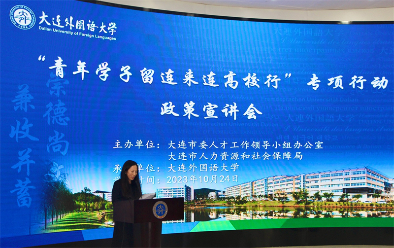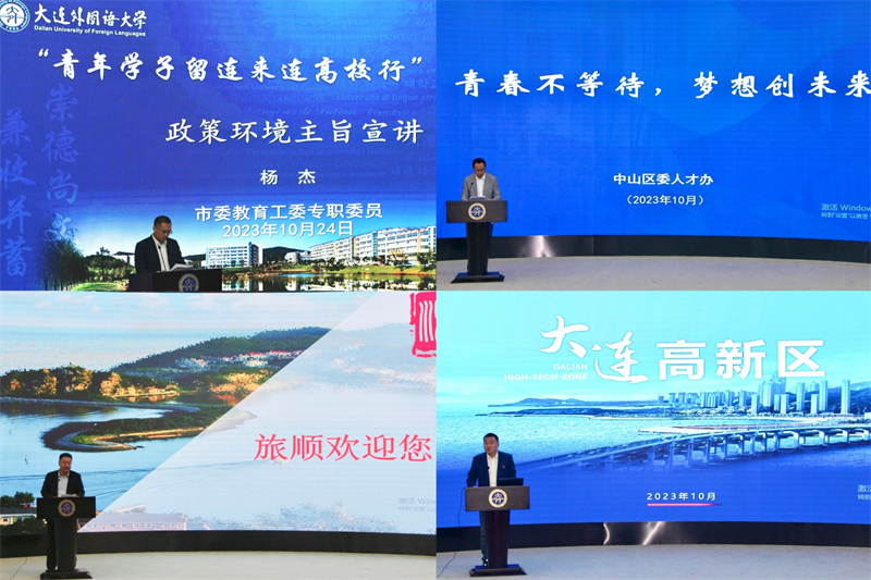 大连政策宣讲会在图书馆报告厅举办。刘风光副校长对市委、各区委组织部、市区人社部门、教育部门和在连用人单位对学校就业工作的指导和帮助、对学校人才培养的认可和鼓励表示感谢,介绍了学校和2024届毕业生情为大力吸引青年学子留连来连就业创业,10月24日,学校联合中共大连市委人况,并表示学校将利用好这次机会做好宣传、做好搭建、做好服务。市委教育工委专职委员杨杰作政策环境主旨宣讲,介绍了大连市的未来前景、事业平台、人才政策和服务环境,邀请毕业生在连就业。中山区委组织部副部长金永宏、旅顺口区委组织部副部长王德忠、高新区人才服务中心副主任尹航分别推介了区域发展环境。东软教育集团、安永会计师事务所(大连)、泰星能源、杰路咨询共4家用人单位依次进行了单位推介。