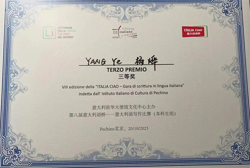 10月,由意大利驻华使馆文化处主办的第八届“ITALIA CIAO/意大利语桥”——意大利语写作比赛结果公布,我院意大利语专业2020级学生杨烨从全国23所高校的74名参赛选手中脱颖而出,斩获三等奖的佳绩。
