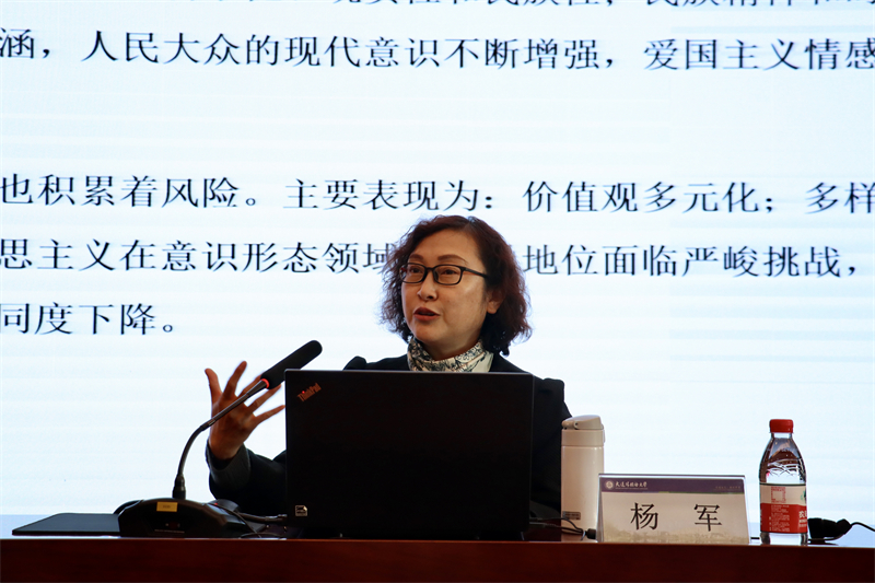 报告会特邀武汉大学马克思主义理论与中国实践协同创新中心研究员、武汉大学马克思主义发展史学科带头人、博士生导师杨军教授作专题报告。杨教授从理论和实践层面,详细阐释了“新时代我国面临的意识形态风险”“新时代党的意识形态理论新拓展”“新时代党的意识形态工作新创举措”“新征程上进一步推进意识形态工作的新部署”四个方面内容,强调了新时代意识形态工作的极端重要性,坚守马克思主义在意识形态领域的指导地位的极端重要性,为积极探索意识形态工作的多种形式,不断提升意识形态工作能力给予了有力指导。