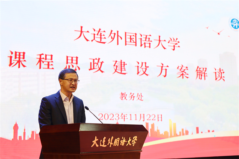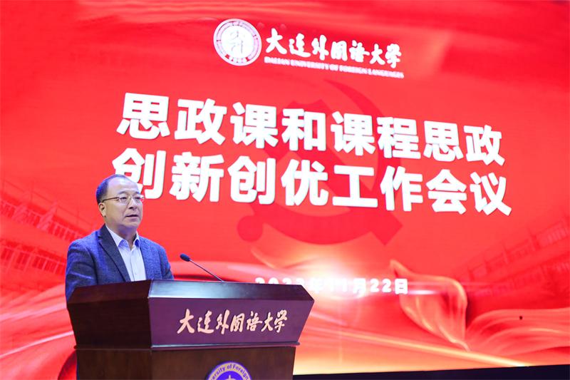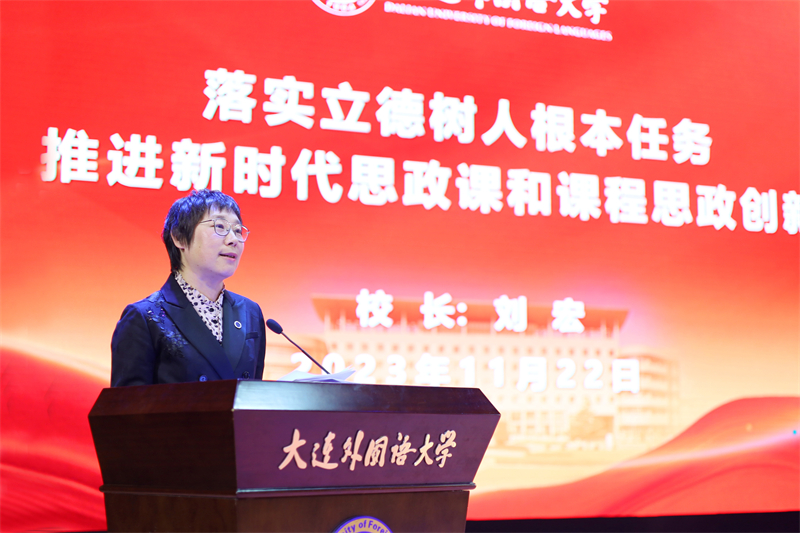 校长刘宏在会上作了题为《落实立德树人根本任务 全力推进新时代思政课和课程思政创新创优》的报告。报告全面总结了近年来beat365思政课和课程思政建设工作的总体情况,分析了目前工作存在的问题,部署了新时代高校思政课和课程思政建设工作的新任务与新要求。她指出,思政课和课程思政教学进一步创新创优要充分发挥外语院校特色,充分利用旅顺丰富的爱国主义教育资源,善用“大思政课”,聚焦厚植爱国主义情怀,坚持“学生中心、产出导向、持续改进”的教育教学理念和导向,以“思政课程”与“课程思政”双轮驱动,着力打造以“外国语、中国心”为目标,以第一课堂、第二课堂、社会课堂和网络课堂为建设重点的“三全育人”特色。她就下一步工作作了四方面的重点部署:一是全面加强党对思政课和课程思政建设的领导,把牢“方向舵”。要坚持用习近平新时代中国特色社会主义思想铸魂育人,再次明确责任、落实落细工作任务。二是以爱国主义教育为主线,不断创新模式和教法,夯实“主阵地、主渠道”。要厚植学生家国情怀,要聚焦用爱国主义凝心聚魂,充分利用第一课堂、第二课堂、社会课堂、网络课堂等主阵地和主渠道,加强爱国主义教育、中外理解沟通教育和中华优秀传统文化教育。要以教法创优为着力点,不断优化课堂教学效果;要以实践创新为着力点,不断提升社会大课堂教学效果;要以“三进”创新为主抓手,不断提升外语专业价值塑造实效。三是推动全体教师育人能力本领的进一步提升,建强“主力军”。要切实加强师德师风建设,完善师德考核评价体系,强化校级省级最美教师、教学名师和黄大年教学团队的典型示范作用;提升教育教学能力,加强隐性和显性教学方法的研究,思政课教师与专业课程教师联合共建教学团队制度和机制,打造一批思政“金课”和课程思政示范课;提升教师数字化教学能力,充分发挥新技术优势推动课堂教学革命,促进思政课和课程思政质量的整体提升。四是加强外语学科和马学科等各学科建设水平,为开展好思政课和课程思政提供有力学科支撑。进一步聚焦马克思主义理论三个学科方向的重点研究问题,做好外国语大学思政联盟建设。加强外语学科中区域国别方向和比较文学与跨文化交际方向建设,加强中国语言文学学科建设,促进学校各学科整体发力,为思政课程和课程思政的开展提供学科基础保证,为提高中国的国际传播能力、构建人类命运共同体作出积极贡献。