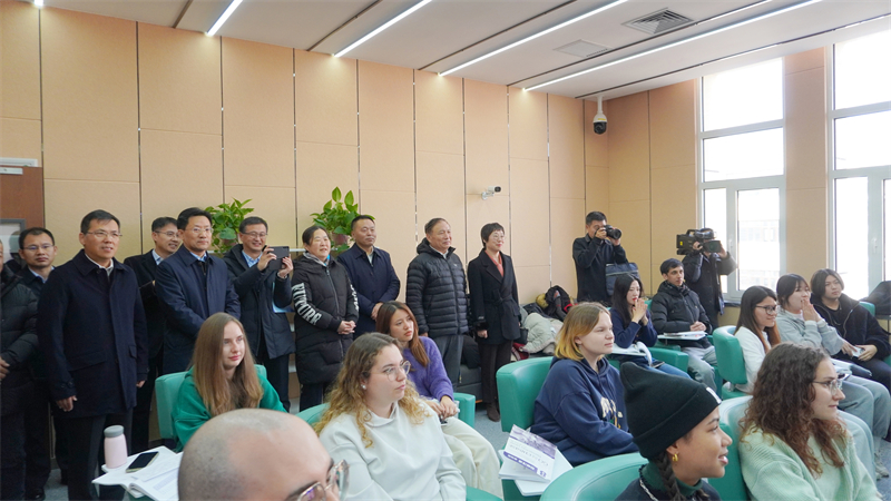 座谈会后,代表小组一行实地考察了学校国际中文教育大楼,现场观摩了校内留学生与俄罗斯新西伯利亚国立技术大学孔子学院学生的线上线下连线教学,杨赤代表还就京剧艺术表演与线上线下中外师生进行了交流。
