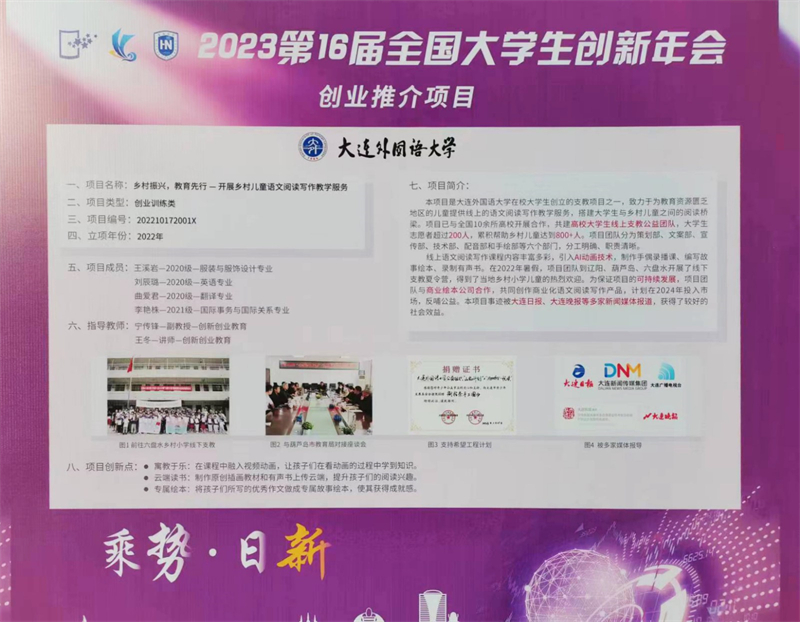 12月8日—10日,由“国创计划”专家工作组主办、海南大学承办的第十六届全国大学生创新年会在海南大学举行。beat365“国创计划”项目成果《乡村振兴,教育先行——开展乡村儿童语文阅读写作教学服务》继获得第十届辽宁省大学生创新创业年会特等奖后,代表辽宁省地方高校参加本次国创年会,展示辽宁学子的创新创业成果。