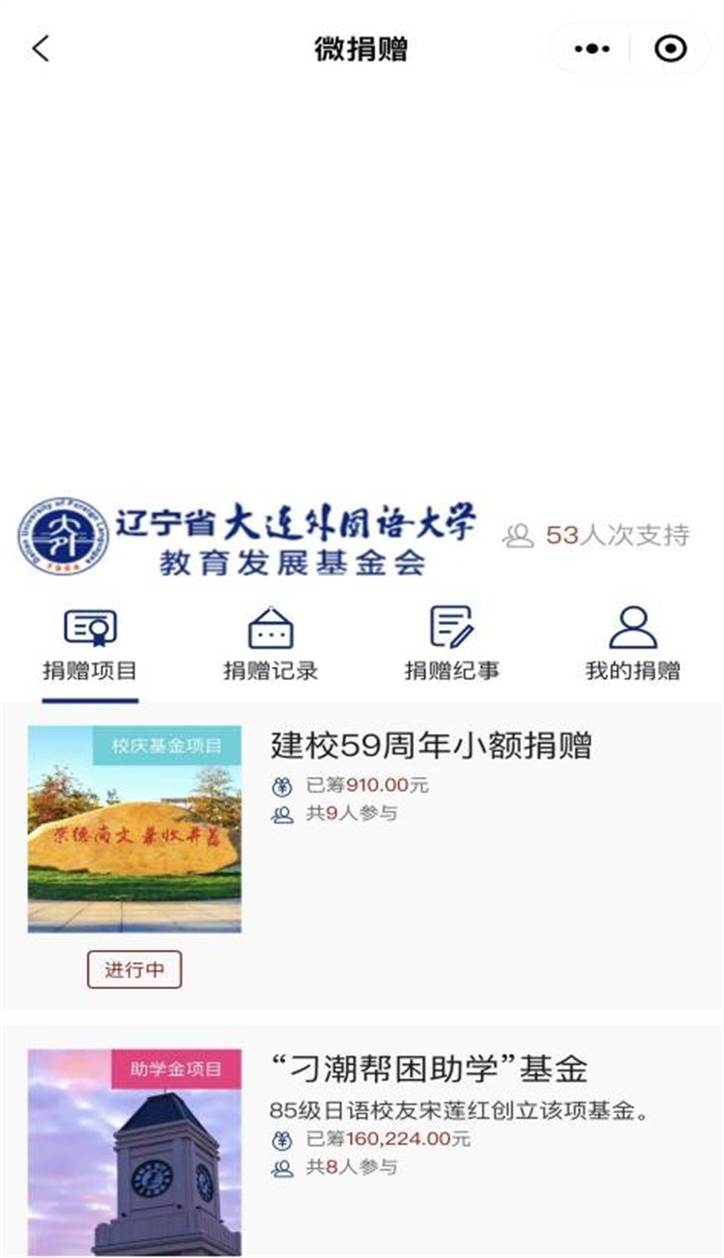 1.依托大外人小程序推出为庆祝母校60周年校庆捐赠项目;