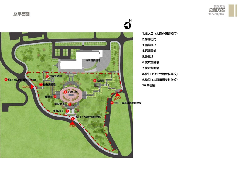 校友广场规划建设在旅顺校区国际中文教育楼前,占地面积2.3万平方米,计划2024年3月开工建设,2024年6月30日前竣工,建设时间90天。校友广场设计三个不同的园区入口,分别展示不同时期的校园入口原貌复刻历史校园,让整个园区具有时代印记,呼应校园的新中式风格,园区内部中心景观复制南山校区假山水景,以现代的设计手法再现历史经典景观元素,围绕新中式校园景观建设景观节点廊架,石刻广场等景观元素,同时增加校友签到墙、校友捐赠墙,满足来访校友的校园打卡捐赠需求。