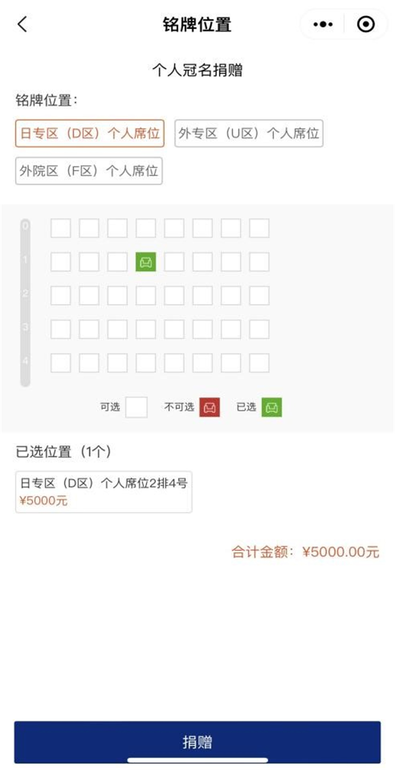 填写捐赠方名称之后可选择捐赠席位及金额。