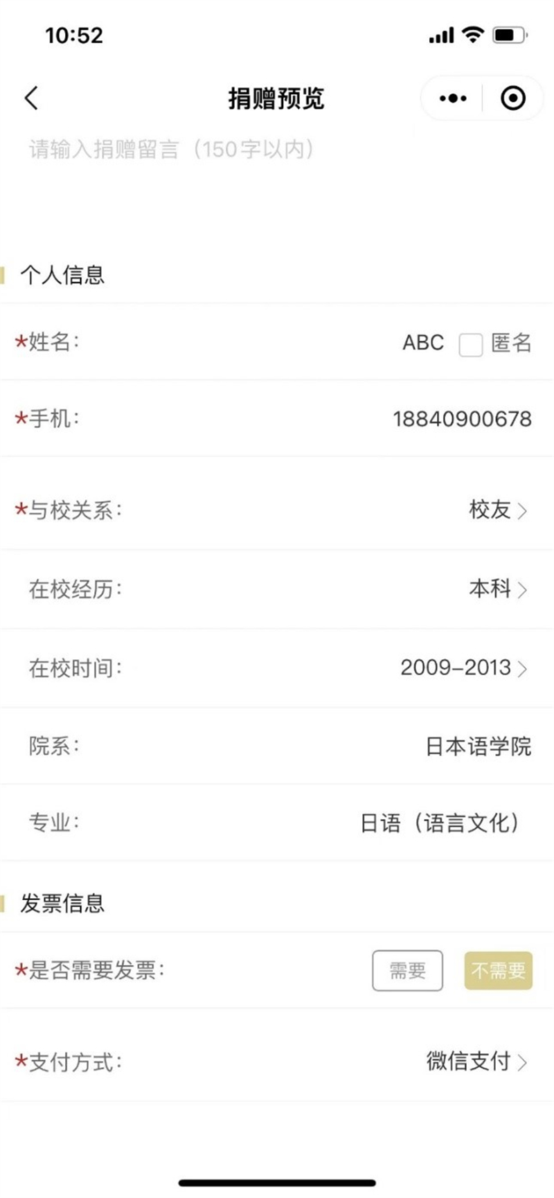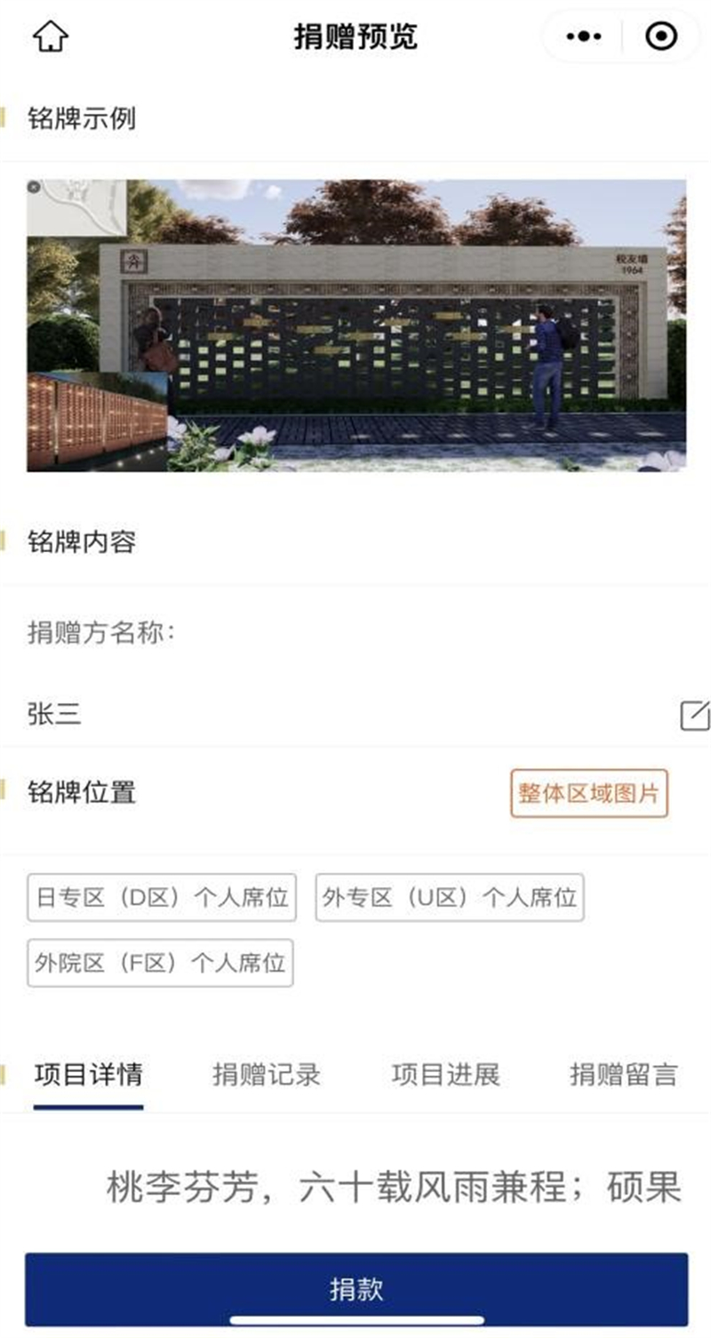 完成以上步骤,即完成捐赠并获得铭牌席位。注:捐赠人信息必须详细注明、联系方式、与学校关系、在校经历、在校时间、院系、专业。两人以上(含2人)共同捐赠,需详细备注每个人信息。