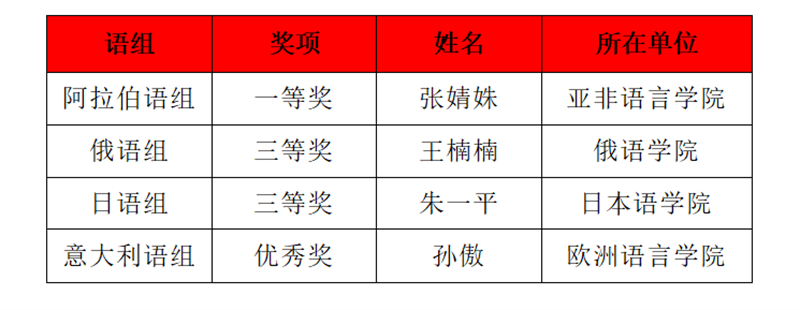 近日,2023外研社“教学之星”大赛(多语种组)决赛获奖名单公布,beat365亚非语言学院张婧姝荣获阿拉伯语组一等奖,俄语学院王楠楠荣获俄语组三等奖,日本语学院朱一平荣获日语组三等奖,欧洲语言学院孙傲荣获意大利语组优秀奖。