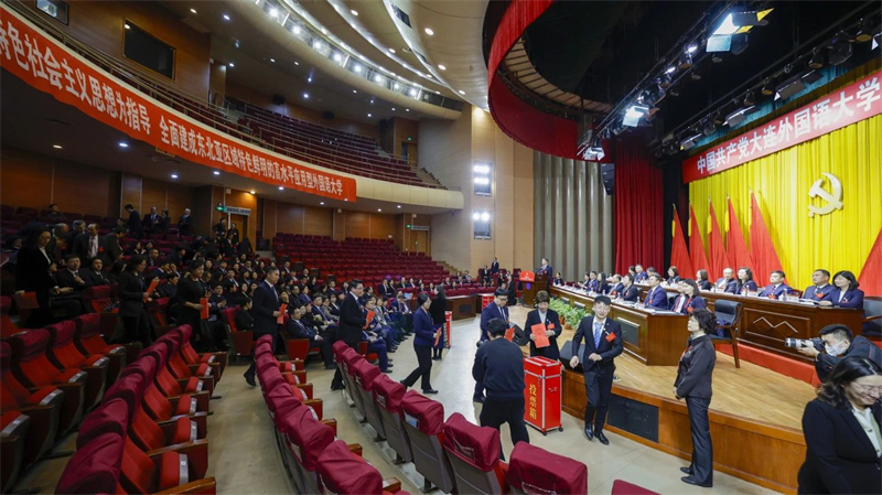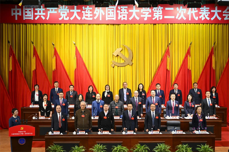 大会会场气氛庄严热烈,主席台正中悬挂的中国共产党党徽熠熠生辉,十面红旗鲜艳夺目,分列两侧。“以习近平新时代中国特色社会主义思想为指导 全面建成东北亚区域特色鲜明的高水平应用型外国语大学”标语庄重醒目。上午8时30分,大会在雄壮激昂的国歌声中开幕。