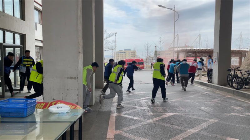 随着演习开始的指令下达,火灾疏散逃生大演练随即展开。阵阵模拟浓烟飘起,宿管人员迅速拉响警报,引导员立刻组织公寓内的学生弯腰、捂住口鼻、快速有序地从各寝室楼逃离“火场”,疏散到楼外安全区域。