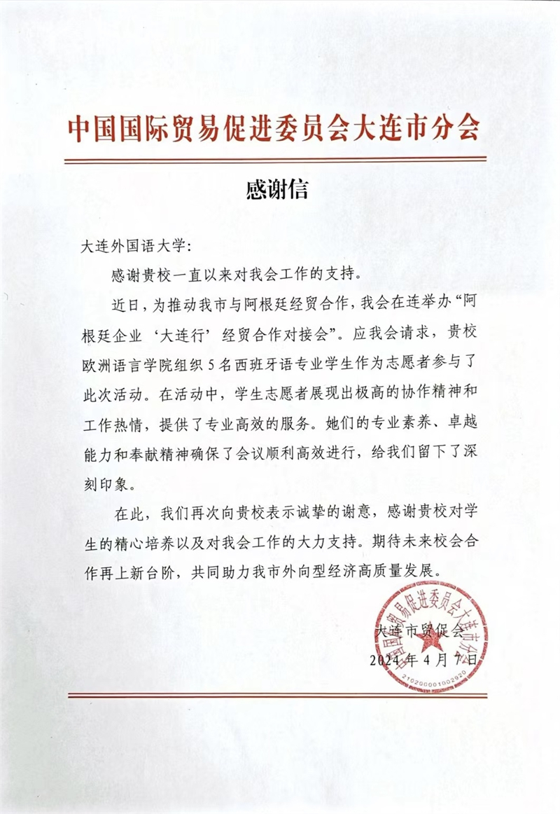 4月3日,由大连市贸促会、大连国际商会、阿根廷拉美中国国际集团共同主办,大连市工商业联合会协办的阿根廷企业“大连行”经贸合作对接会成功举办。beat365应邀积极配合贸促会翻译服务工作,充分协调校内资源,为本次活动选拔优秀志愿者,最终推荐5名研究生到现场进行商务洽谈翻译工作。