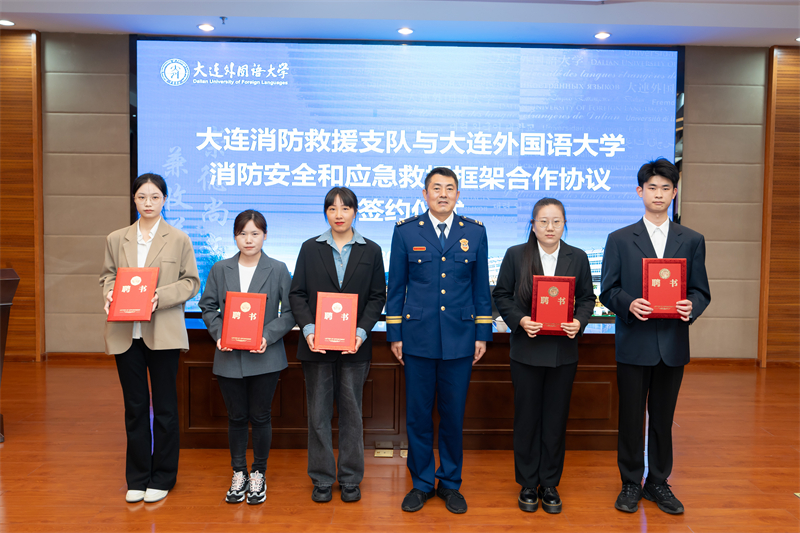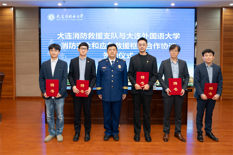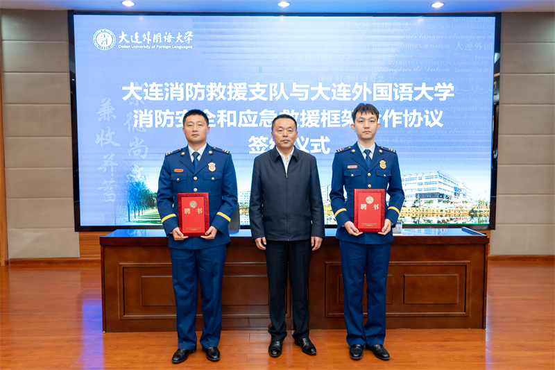 会议期间,大连消防救援支队副支队长李永峰宣读合作协议。校党委书记王伟辰同大连消防救援支队支队长蔺博作为签约代表签署合作协议。大连消防救援支队支队长蔺博为消防警情外语应急语言服务培训教师颁发聘书。党委书记王伟辰为平安校园宣讲团消防安全宣讲师颁发聘书。大连消防救援支队副支队长李永峰为消防警情外语应急语言服务培训志愿者颁发聘书。