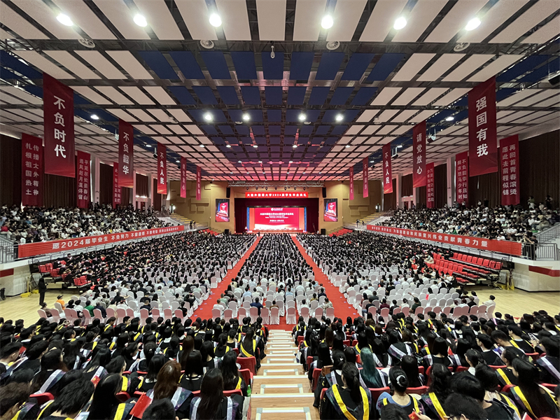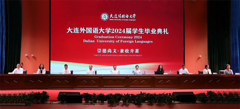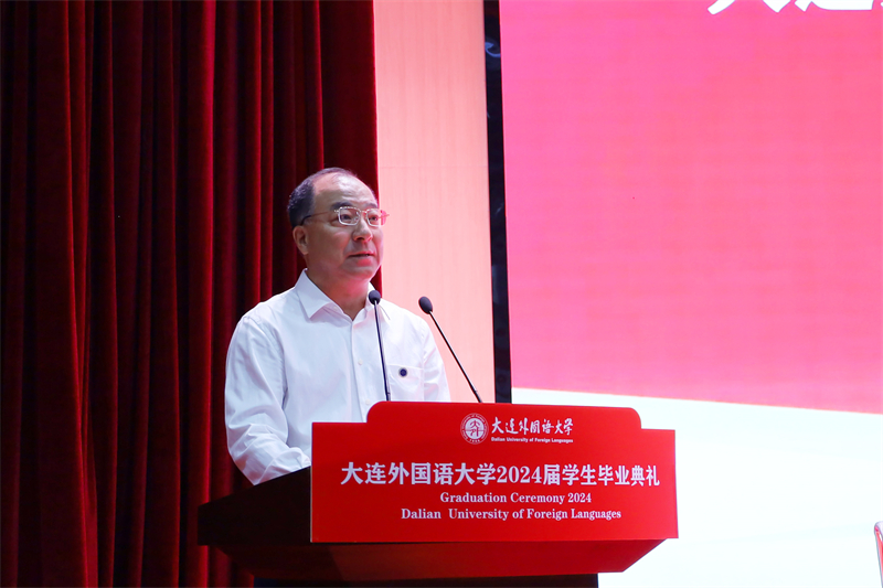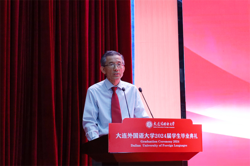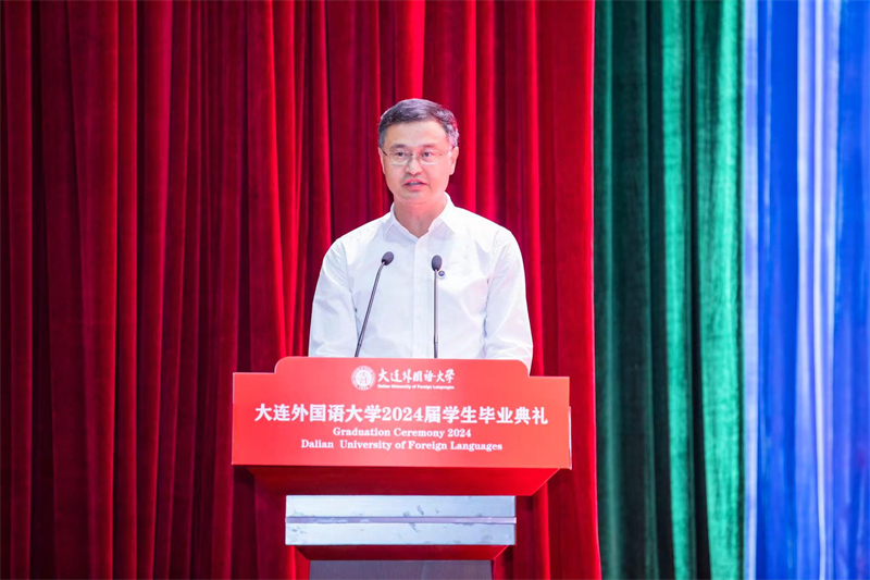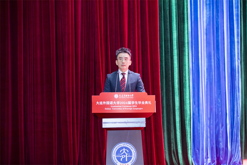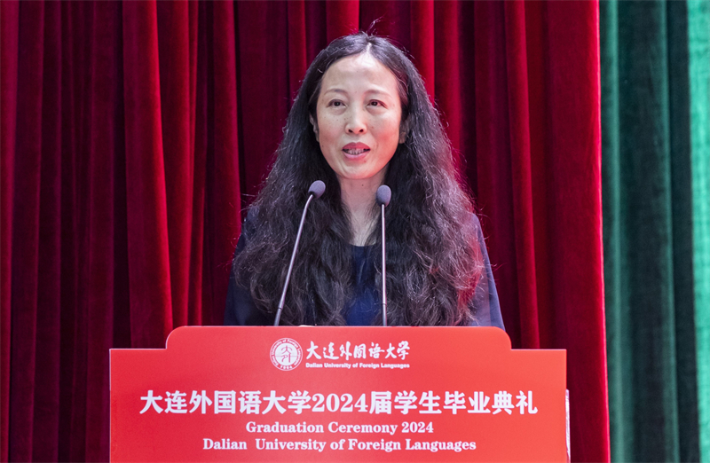 校长刘宏教授发表讲话。她对全体2024届毕业生表示祝贺,她感慨同学们在大外不仅收获了知识、友情和责任感,更收获了成长的勇气、信心和力量,用实际行动诠释了当代青年的责任与担当。每一位毕业生都是母校灿烂星空中独特的一颗星,都是母校心中永远的牵挂!她对大家提出三点希望:一是希望大家坚持终身修德,以德为基,崇德向善。修好公德和私德,做一个德才兼备的人,是同学们终生的必修课,也是大家通往成功之路的基石。二是希望大家坚持终身学习,勇于创新,智慧向善。希望同学们走出校园后,继续坚持有始有终地学习,弘扬人文精神,坚持智慧向善,不断提升自己的全球胜任力,让人文与技术在和谐共融中创造更加多彩的文化,让人类与科技在高效合作中构建更加美好的世界。三是希望大家坚持终身进取,向阳而生,乐观向善。希望同学们永葆锐意进取的精神,向下扎根、向内积蓄,用坚韧不拔的毅力去迎接未来每一个困难和挑战,把生活过成自己心中最喜欢最满意的模样。