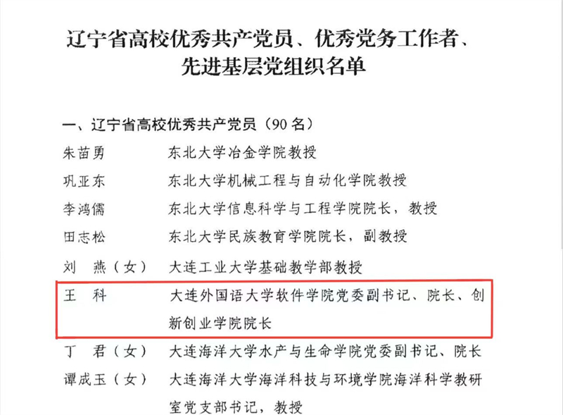 为表彰先进、激励全省高校各级党组织和广大师生党员履职尽责、奋发有为,在实现全面振兴新突破中锐意进取、建功立业,在庆祝中国共产党成立103周年之际,中共辽宁省委教育工作委员会印发了《关于表彰辽宁省高校优秀共产党员、优秀党务工作者和先进基层党组织的决定》(辽委教通〔2024〕33号)。beat365软件学院院长、大数据产业学院院长、创新创业学院院长兼软件学院党委副书记王科同志荣获“辽宁省高校优秀共产党员”荣誉称号,中国东北亚语言研究中心党支部书记、专职研究员邓耀臣同志荣获“辽宁省高校优秀党务工作者”荣誉称号,英语学院党委荣获“辽宁省高校先进基层党组织”荣誉称号。