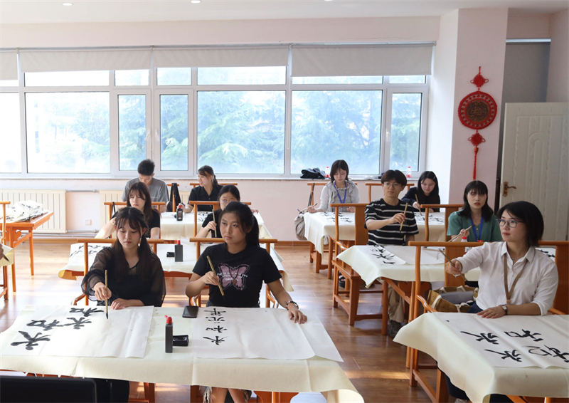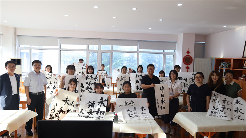 访问团一行首先在日本语学院与学生进行了交流座谈,两国青年畅谈了自身学习与生活经历,在坦诚交流中增进了理解,建立了友谊。随后两国学生在汉学院学习了中国茶艺及书法课程,学生们通过学习深切感受到了中国茶文化的独特魅力及中国书法的艺术韵味,在亲手书写的书法作品中亲身感受到了中华文化的博大精深。