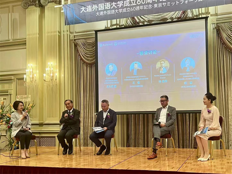 活动最后,现场还举办了“聚焦中日企业的创新与挑战”主题的圆桌论坛,大外1997级校友张翠主持,Tencent Japan,Director林昌伸先生及日本大学商学部教授高久保豊先生,中国驻大阪观光代表处顾问、1982级校友王伟,日本华侨华人博士协会副局长、1994级校友杨岩博士四位嘉宾从实际经验出发,深入探讨了中日企业在新时代背景下的合作与创新模式,令与会者受益匪浅。
