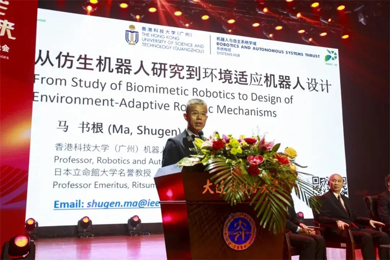 日本工程院外籍院士、香港科技大学(广州)教授、国际机器人专家马书根发表了主题为《从仿生机器人研究到环境适应机器人设计,再应用到智能装备开发》的演讲。