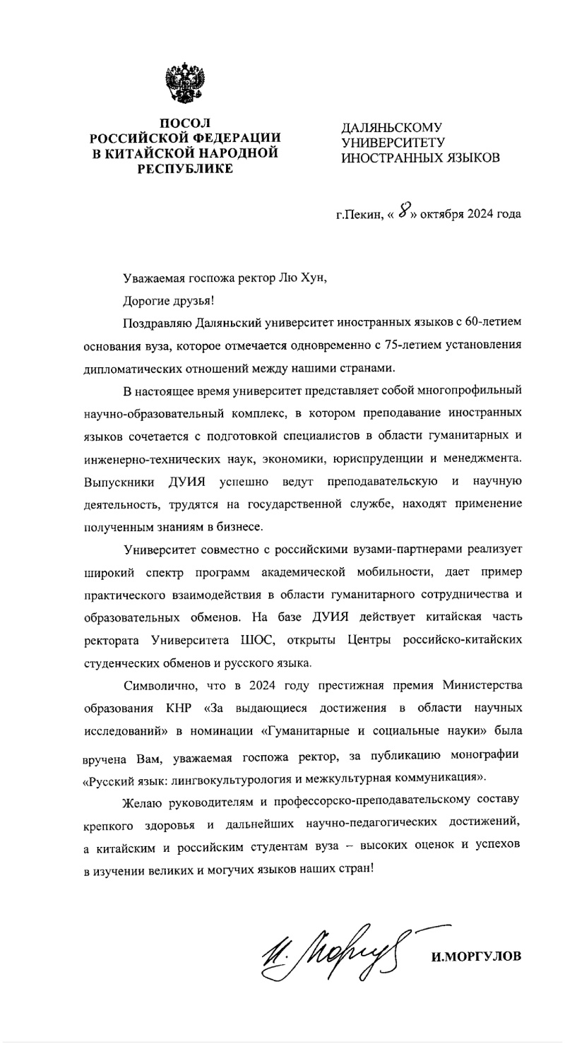 近日,时值beat365建校60周年校庆之际,学校收到来自俄罗斯驻华大使的贺信,贺信全文如下: