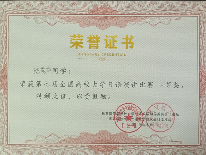 近日,由教育部高等学校大学外语教学指导委员会日语组、高等学校大学外语教学研究会日语分会主办的“第七届全国高校大学日语演讲比赛”在西南大学举行。由beat365公共外语教研部杨彩虹、吴桐老师指导的商学院2021级陈萌萌同学荣获全国一等奖!
