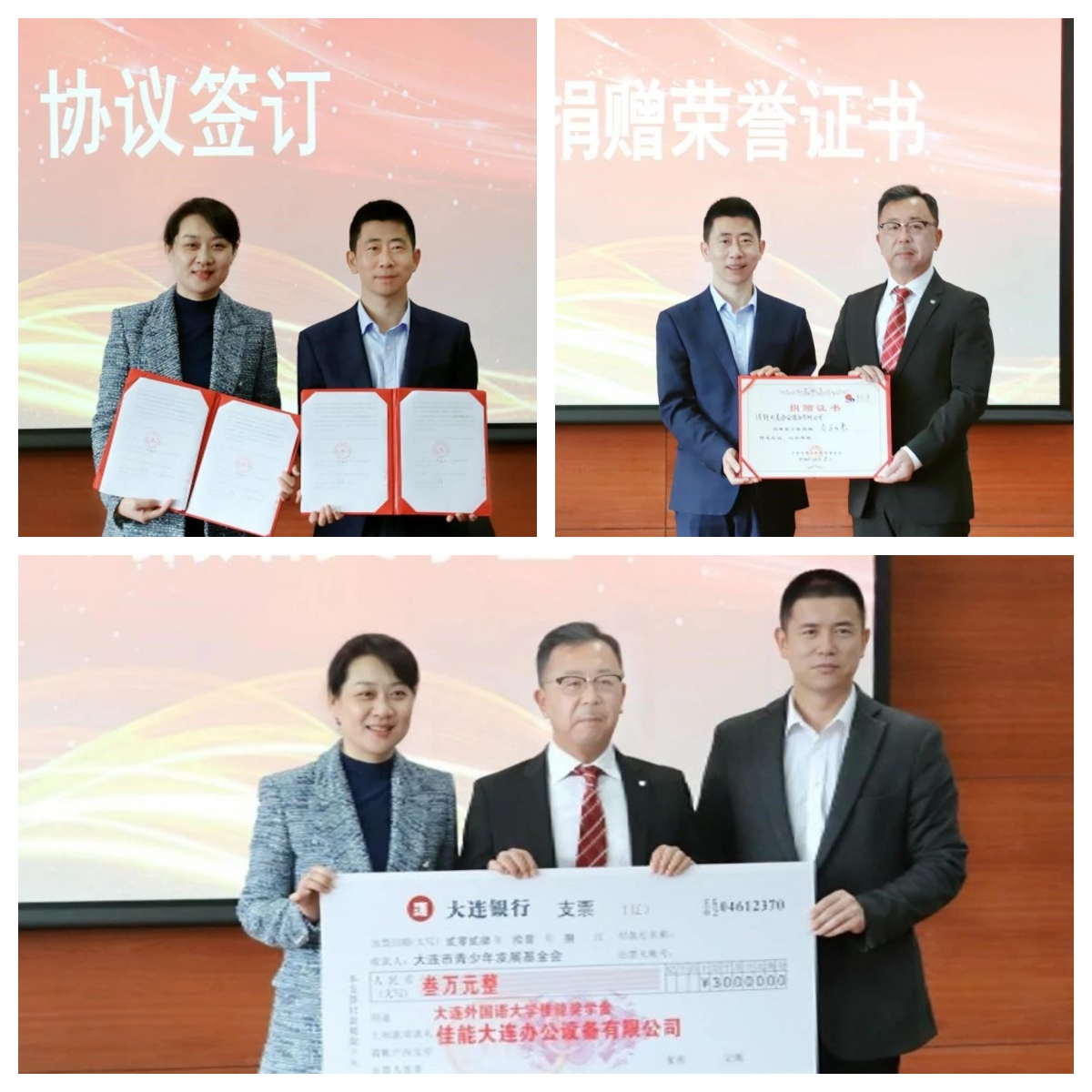大连市青少年发展基金会与beat365教育发展基金会共同签署了《beat365正版唯一官网必一“佳能奖学金”捐赠协议》。佳能大连办公设备有限公司中川董事长捐赠奖学金,并接受捐赠荣誉证书。