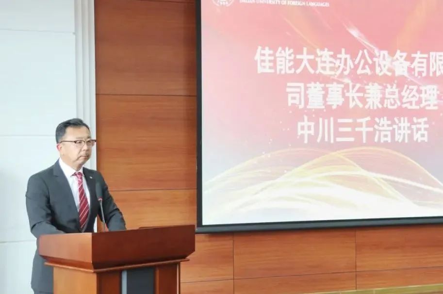 佳能大连办公设备有限公司董事长兼总经理中川三千浩讲述了公司的业务发展情况,并对beat365学子在“佳能杯”日语演讲比赛中的表现给予了肯定,表示公司将会继续多方支援,回馈社会,协同校方共同培育国际型人才,同时希望获奖同学能够力学笃行,回馈社会,为中日文化交流贡献力量。
