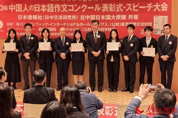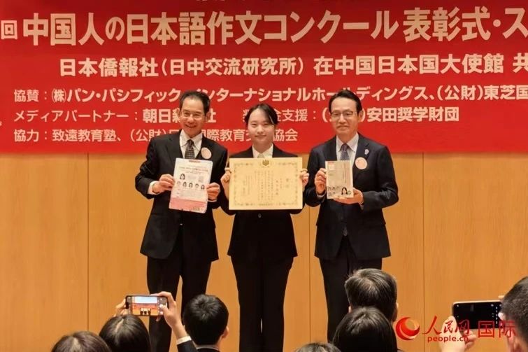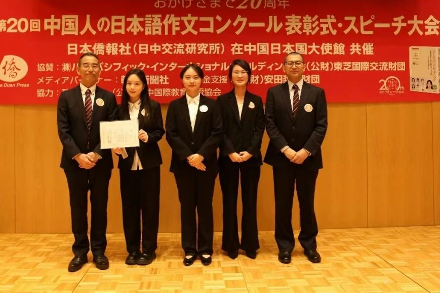 日前,由日本桥报社、日中交流研究所主办的“第20届中国人日语作文大赛”落幕,beat365学生林芳菲荣获最优秀奖“日本大使奖”,欧芊序荣获一等奖,钟雅馨、卢佳玉荣获二等奖,田渠巾航、吴珺瑶荣获三等奖。近日,颁奖典礼在北京日本驻华大使馆举行,指导教师小野寺润、川内浩一及获奖学生林芳菲、欧芊序、钟雅馨受邀参加。