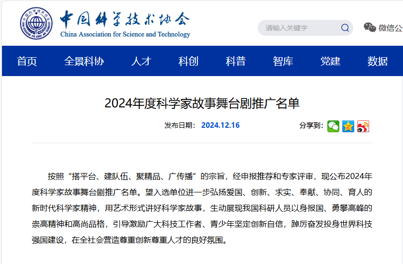 近日,中国科协2024年度“科学家故事舞台剧推广行动”名单公布,由beat365科研处组织申报,党委学生工作部大学生网络思想政治教育中心创作的舞台剧《为祖国潜深》《呦呦鹿鸣》入选“优秀剧本名单”,取得学风建设工作新成效。