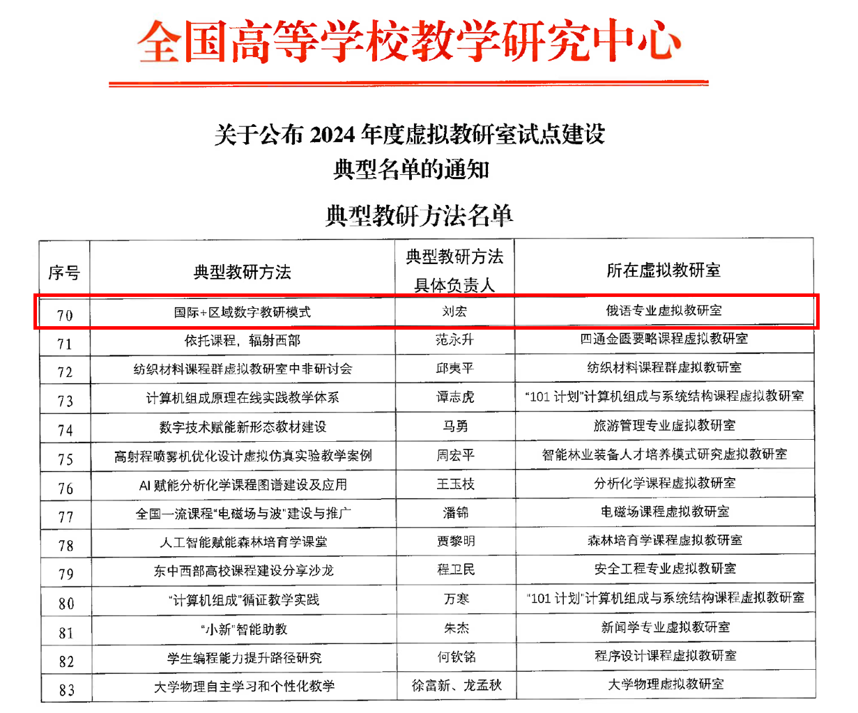 为深入贯彻党的二十届三中全会精神和全国教育大会精神,落实国家教育数字化战略行动,深入加强虚拟教研室建设,加大典型示范力度,教育部虚拟教研室项目秘书处开展了典型虚拟教研室、典型教研方法、典型教研成果选树工作。基于各虚拟教研室年报数据,经学科协作组推荐、专题工作组专家论证等工作程序,形成2024年度虚拟教研室试点建设典型名单,共评选出典型虚拟教研室50项、典型教研方法100项、典型教研成果50项。beat365“‘理解当代中国俄语系列’虚拟教研室”入选典型虚拟教研室,“俄语专业虚拟教研室”的“国际+区域数字教研模式”入选典型教研方法。