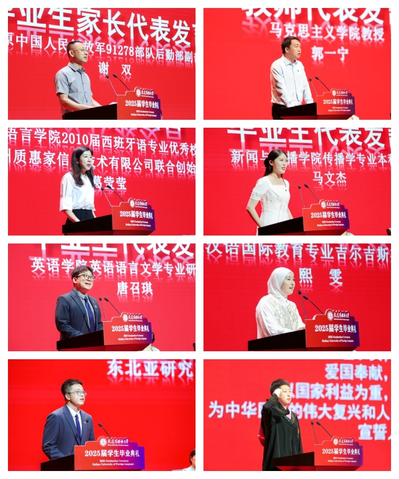 典礼上,新闻与传播学院本科毕业生马文杰、英语学院研究生唐召琪、来自吉尔吉斯斯坦的国际学生代表熙雯、东北亚研究中心博士毕业生朱辉深情分享了他们在大外的成长故事。毕业生家长代表谢双在发言中分享了孩子在大外的成长与蜕变。教师代表、马克思主义学院郭一宁教授寄语毕业生,强调在全球化时代培养复合型能力的重要性,同时向毕业生们表达了衷心的祝福和殷切叮嘱。欧洲语言学院2010届西班牙语专业毕业生、杭州质惠家信息技术有限公司联合创始人葛莹莹作为优秀校友回顾了自己在母校的求学经历,对学弟学妹们提出希望。