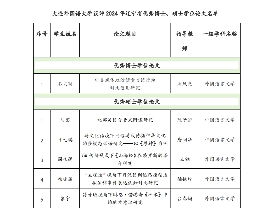 学位论文水平是研究生培养水平的综合体现,是对研究生培养过程质量把关的有效检验。近年来,beat365高度重视研究生培养质量,以“三进”为抓手,推动研究生课程思政提质增效;以新文科建设和交叉学科建设为引领,创新研究生涉外复合型人才培养;深化培养模式改革,加强研究生分类培养体系建设;努力践行习近平总书记提出的教育家精神,加强特色交叉学科导师团队建设,打造“师德高尚、业务精湛”的一流导师队伍。今后,学校将不断提升研究生人才培养水平,提升学校研究生教育服务辽宁全面振兴新突破的能力和水平,为教育强国、教育强省建设贡献大外智慧与力量。(刘翔)