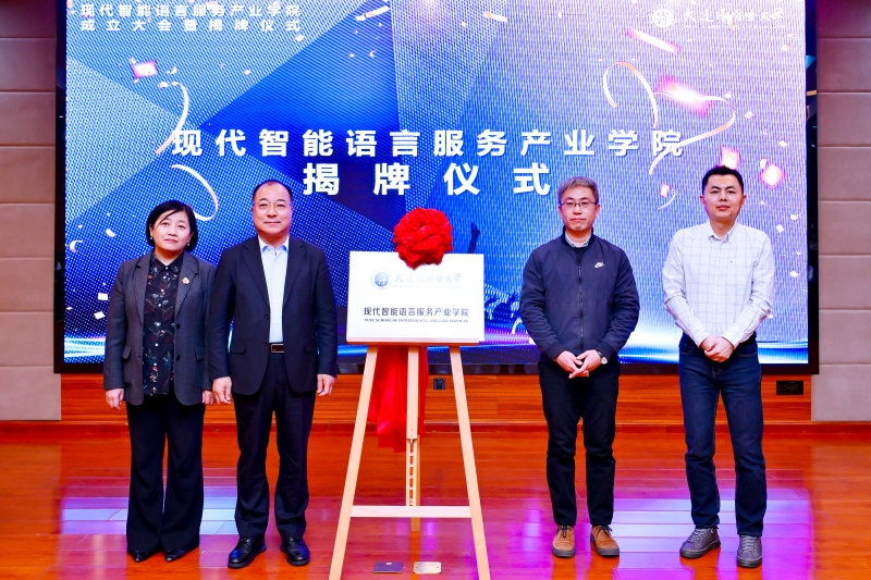 在全体与会者的见证下,丛明才校长与杨东副主任、赵睿阳经理、现代智能语言服务产业学院院长邹德艳共同为“beat365正版唯一官网必一现代智能语言服务产业学院”揭牌。